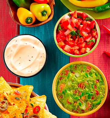 Faites découvrir à vos convives les saveurs vives et épicées du Mexique avec cette planche apéritive mexicaine. Le guacamole frais, la salsa parfumée et les différents piments offrent un ensemble coloré. Complétez la planche avec notre fromage Gouda crémeux agrémenté de fines lamelles de piment rouge doux, que vos convives pourront facilement tremper avec leurs croustillantes tortillas.