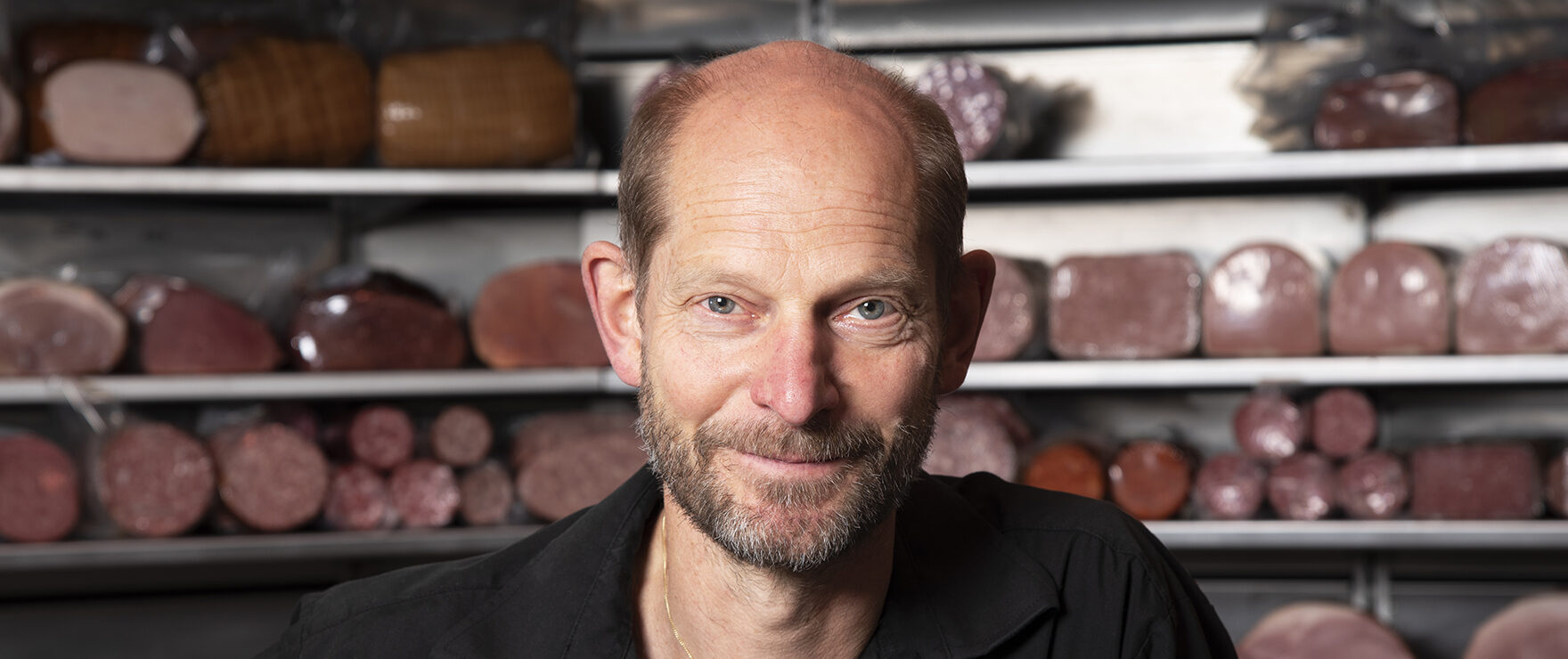 Le maître boucher, Hans de Goeij, vend les fromages d’ERU dans sa boucherie et avec lesquels il expérimente diverses recettes