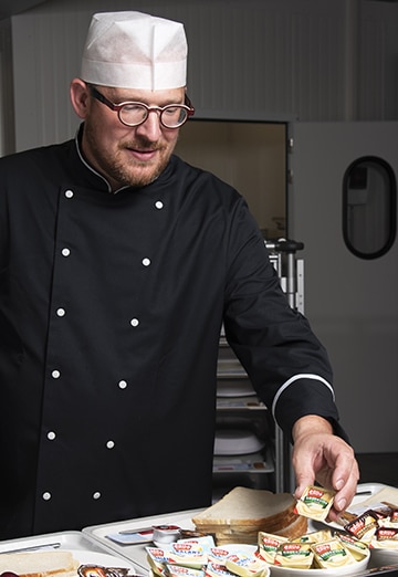 Wo auch immer Sie arbeiten, mit unserem vielseitigen Sortiment können Sie jeden Tag überraschen. So sind beispielsweise ERU-Portionsverpackungen ideal zur hygienischen Präsentation eines umfangreichen Sortiments an Schmelzkäse in der Gastronomie, in der Kantine und im Pflegebereich. Lesen Sie hier, wie Frühstücksköchin Sandra Vanden Kieboom vom Van der Valk Hotel Deventer ihre Gäste mit ERU-Portionsverpackungen am Frühstücksbuffet überrascht.