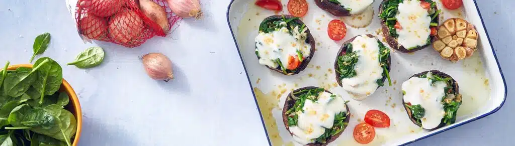 Maak van dinsdag een feestje met dit voedzame gerecht: gevulde portobello’s uit de oven met magere kaas. Deze heerlijke en verantwoorde keuze combineert een rijke smaak met een prachtig presentatie op tafel. Perfect als lunch of diner! De romige kaas en hartige vulling maakt elke hap heerlijk.