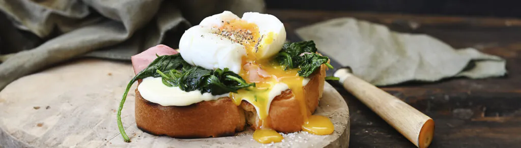 Brioche brood met ham, spinazie, roomzachte smeerkaas en een zachtgekookt eitje