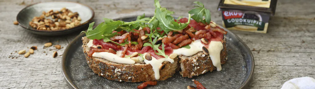 Landbrood met carpaccio, spekjes, rucola, pijnboompitten en kaas