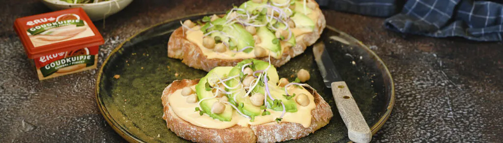 Toast met pittige smeerkaas, avocado, kikkererwten en pittige kiemgroenten