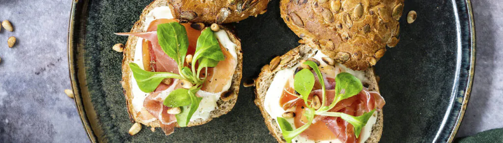 Pompoenbroodje met serranoham, veldsla en pijnboompitten