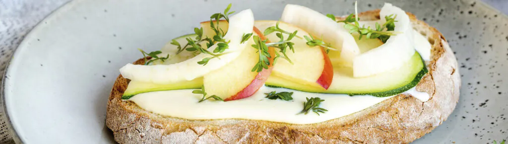 Rustieke boterham met roomzachte smeerkaas, courgette, appel, venkel en tuinkers
