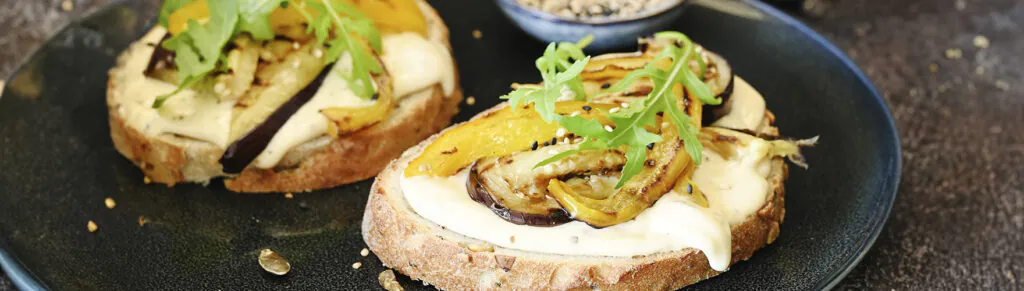 Sandwich met gegrilde groenten, rucola, roomzachte smeerkaas en sesamzaadjes