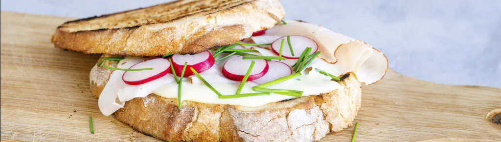 Geroosterde zuurdesem sandwich met kipfilet, radijs en bieslook