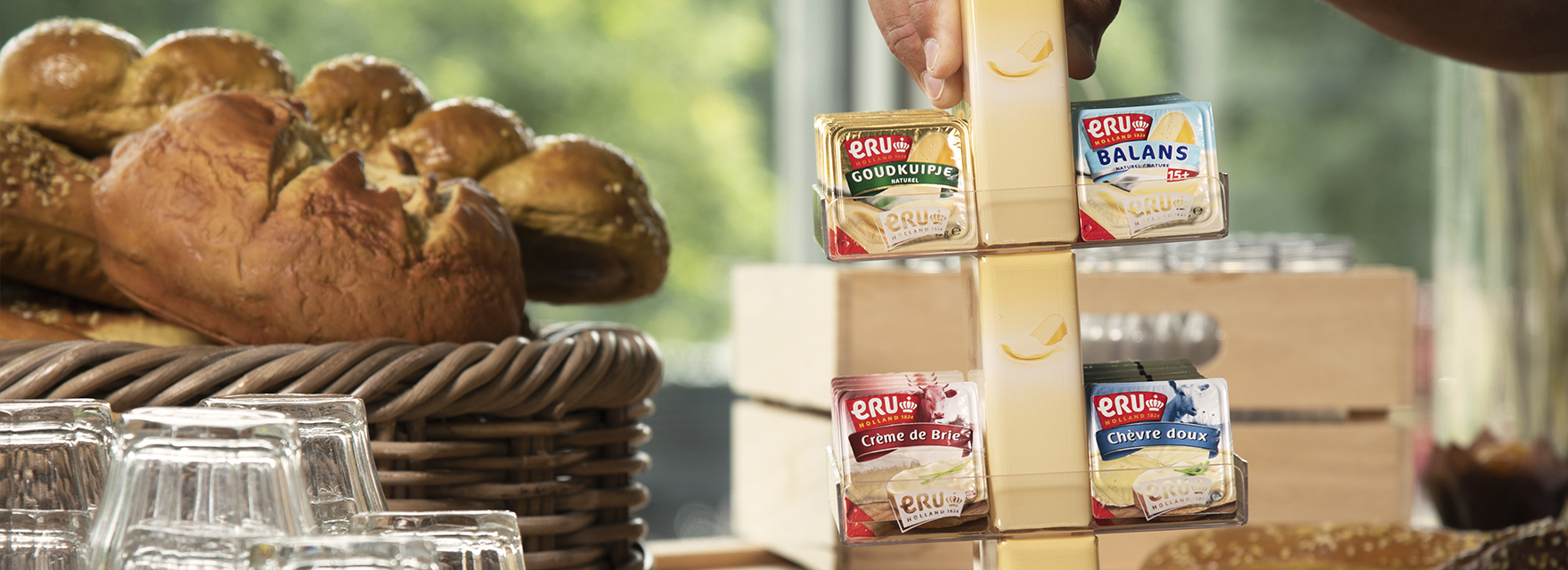 Dank des großen Sortiments an ERU-Portionsverpackungen können Sie Ihren Gästen immer ein wechselndes Angebot präsentieren. Für den Gast, der Bio-Produkte bevorzugt, gibt es den ERU BioGouda. Dank der einzelnen Verpackungen ist die Präsentation auf dem Büfett, dem Brotservierwagen oder in der Frühstücksbox gepflegt und hygienisch.