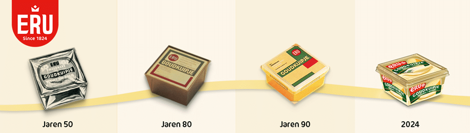 In de jaren 50 kwamen de eerste ERU Goudkuipjes op de markt, verpakt in een stevig aluminiumfolie. In de jaren ’90 zorgde de slogan ‘Ze smelten de kazen!’ voor de groeiende populariteit van het gouden kuipje. Vanaf dit moment werd ook het rode ERU logo toegevoegd aan de verpakking. Het kuipje dat daarna volgde was zeer vernieuwd. Zo werd het ronde logo van ERU aangepast naar een vaandel én introduceerde we het ‘ERU Goudkuipje’ logo. Daarnaast werd de harde kaas op de verpakking afgebeeld, om aan de consument te laten zien dat ERU Goudkuipje is gemaakt van echte Goudse kaas. Natuurlijk is ook de smeuïgheid van ERU terug te zien op de verpakking. Daar draait het immers om: volle, romige, smeerbare kaas.