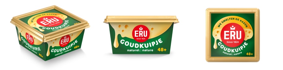 - Door te kiezen voor de halve kaas en smeuïge kaasdruppel heeft het ERU Goudkuipje groen op de deksel een iets prominentere rol aangenomen. Hierdoor komt de smeuïgheid van de kaas beter tot zijn recht. Naast groene elementen blijft uiteraard het goud een belangrijke rol spelen door de gouden rand van de deksel en de échte Goudse kaas die in het kuipje zit. Daarnaast schittert het gouden folie onder de deksel wanneer de consument het kuipje openmaakt.