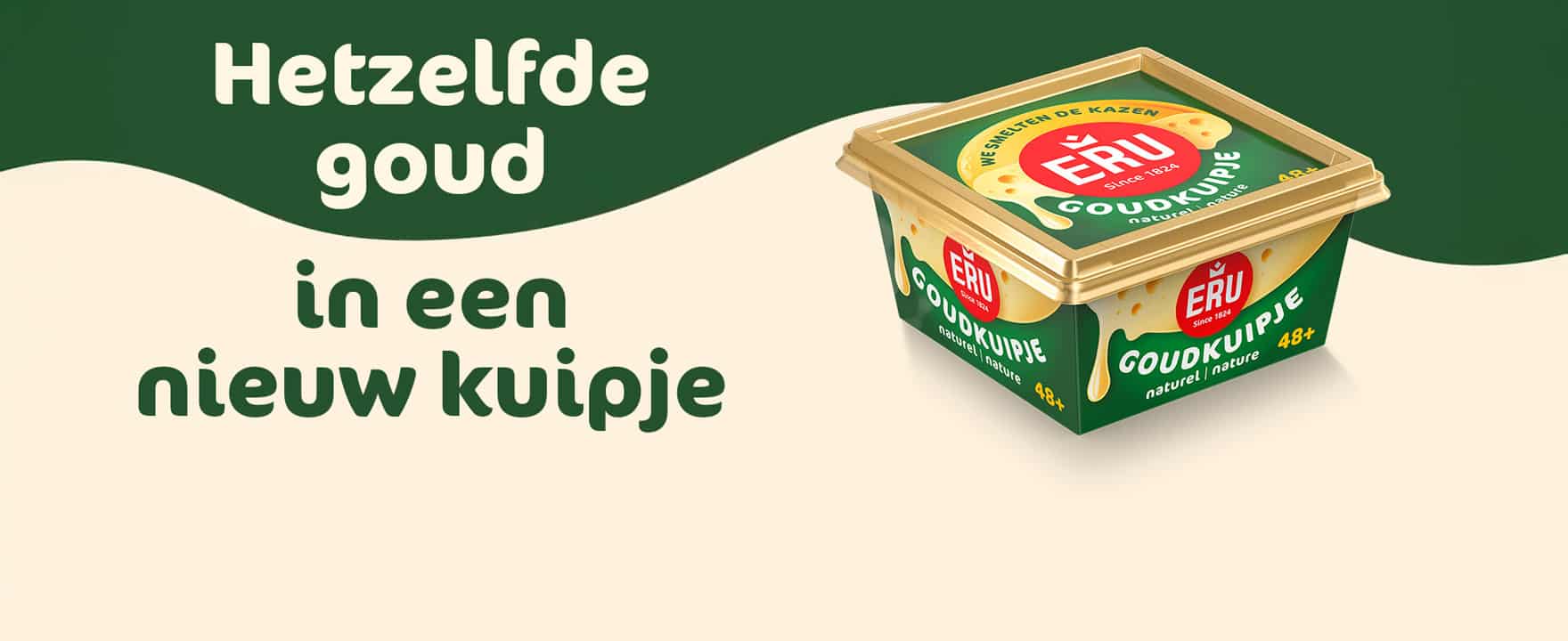 - Door te kiezen voor de halve kaas en smeuïge kaasdruppel heeft het ERU Goudkuipje groen op de deksel een iets prominentere rol aangenomen. Hierdoor komt de smeuïgheid van de kaas beter tot zijn recht. Naast groene elementen blijft uiteraard het goud een belangrijke rol spelen door de gouden rand van de deksel en de échte Goudse kaas die in het kuipje zit. Daarnaast schittert het gouden folie onder de deksel wanneer de consument het kuipje openmaakt.