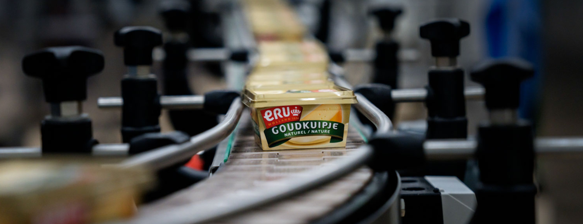Voor Kuijl is het allemaal nieuw. Met zijn bedrijf St. Paul, dat industriële smeltkazen maakt voor bijvoorbeeld pizza’s en kaassoufflés, nam hij Koninklijke ERU vorige maand over. Nu is hij eigenaar van een van de bekendste kaasmerken van Nederland. In veel huishoudens staat het kuipje smeerkaas standaard op de ontbijttafel. De ERU-fabriek langs de A12 produceert jaarlijks tientallen miljoenen verpakkingen.