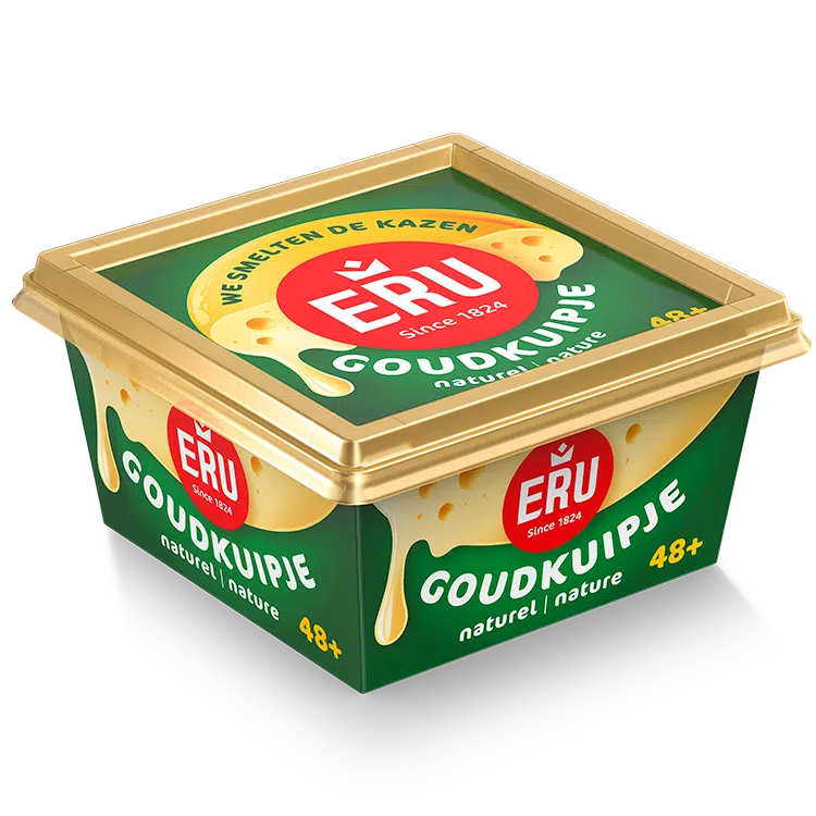Na de rebranding van het logo in 2024 was het tijd voor nieuwe frisse verpakkingen. Brand- en packaging designbureau brum. gaf het design een make-over, zonder het vertrouwde kuipje aan te passen. Ontwerper Jon Sonneveld (brum.): “Op de vorige verpakking gebeurde veel en was het belangrijkste ingrediënt naar de achtergrond verdwenen. We wilden nu echt het product laten spreken. Dat hebben we veranderd.” Het resultaat is een design waarin het intrinsieke product centraal staat; een Goudse kaas die wordt gesmolten.